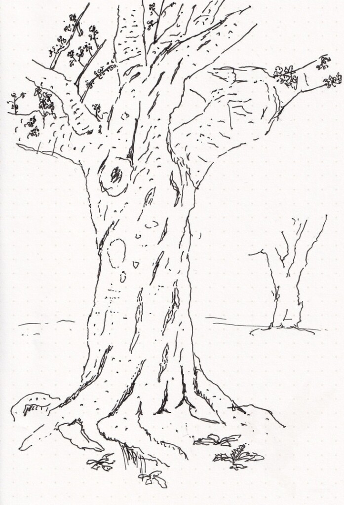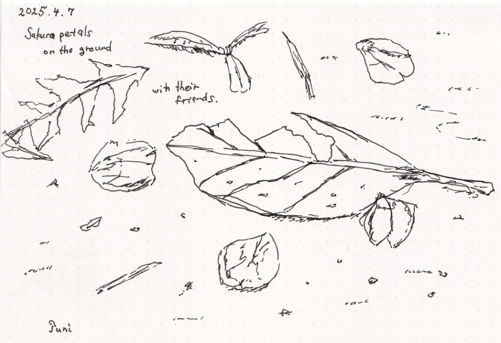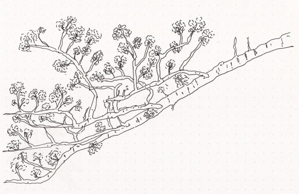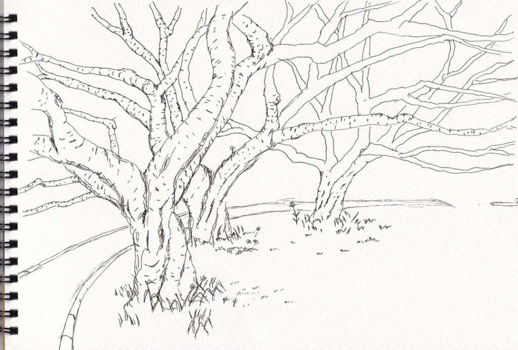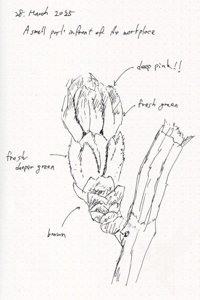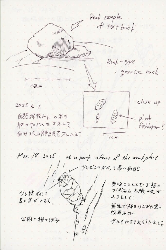 早速、本のとあるページにある岩の絵を真似して描いてみました。なるほどなるほど、確かに岩っぽくなる!おもしろい!そう思って、手元にあった小さいノートとペンをカバンに詰めて、会社のすぐ近くの公園にあった桜のつぼみを描いてみました。そんな最初の絵が、上にある1年くらい前の絵です。