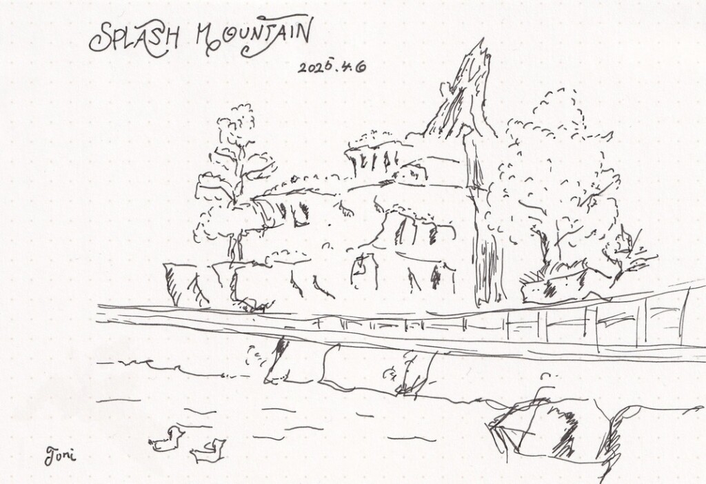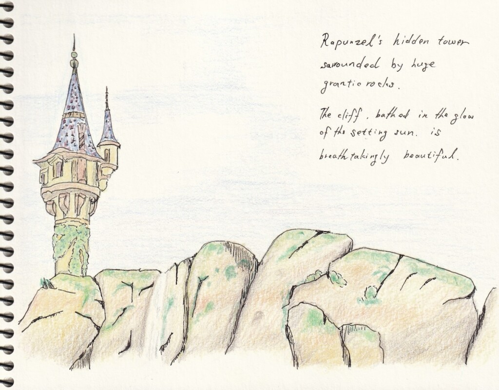 そして季節はスケッチにぴったりな5月でした。この季節の東京ディズニーシー・ファンタジースプリングスは、花や草木に彩られて想像力を掻き立てられる季節です。その美しい風景をゆっくりと見ながら、初めての屋外カラースケッチをしてみました。それがこちらです。