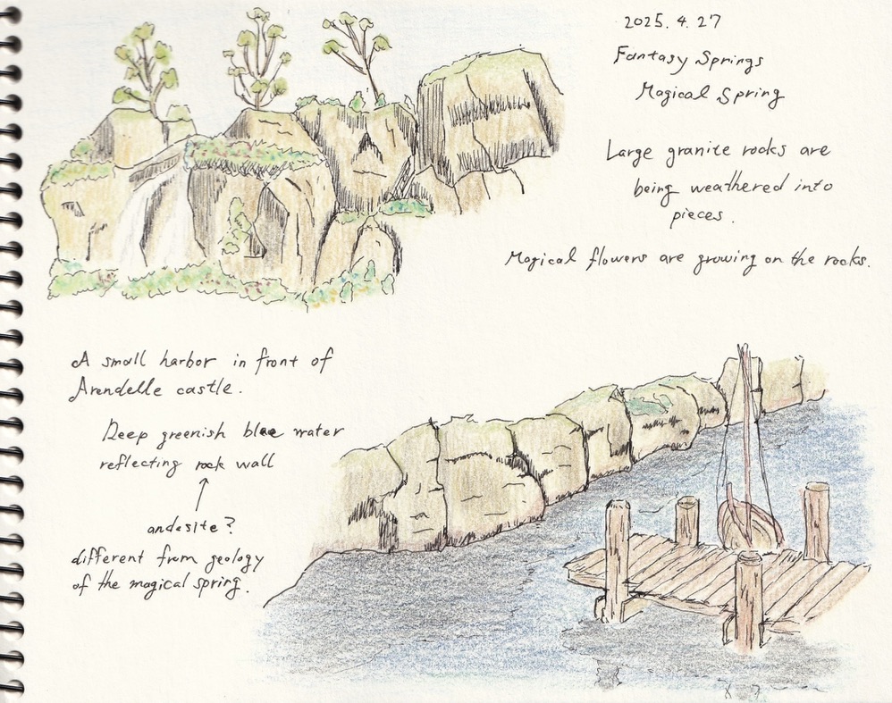 この頃、ファンタジースプリングスが好きすぎて、何度も通っているうちに頭の中で空想のマップが描けるようにまでなっていました。余談ですが、ファンタジースプリングスは本当に素晴らしく、アラビアンコースト側エントランスを山奥に見立て、そこから海へと至るまでの自然風景が、地質学的にとてもしっかりと移ろっているのです。本当に、山から海へ、妖精と自然の作り出したファンタジーの世界を旅しているように感じるのです。