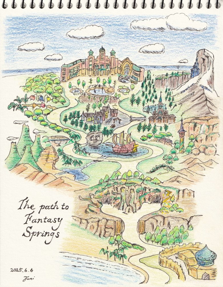 この集大成の絵は、文字で書いてある通り「The path to Fantasy Springs ファンタジースプリングスへの道」です。東京ディズニーシー・アラビアンコーストからファンタジースプリングスを抜け、ファンタジースプリングス・ホテルへ至るまでの風景を描いた、空想の地図です。